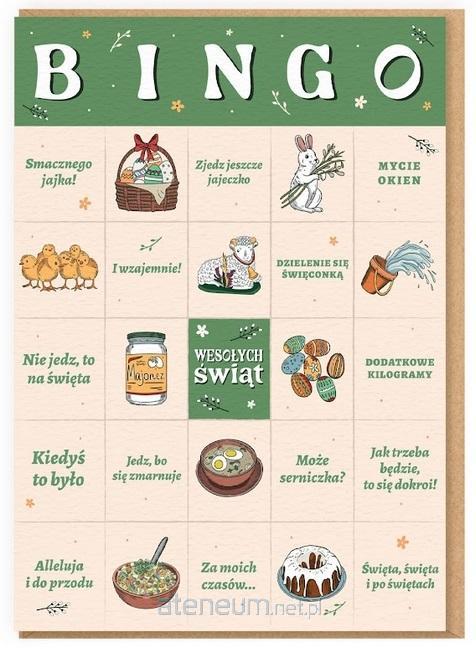 Gotowy na świąteczne posiedzenie, a raczej przejedzenie? Poczekaj, najpierw wielkanocne BINGO! Nie jedz, to na święta. Kiedyś to było Może serniczka? Alleluja i do przodu! Jedz, bo się zmarnuje! I wzajemnie! Kto z nas nie zna tych sezonowych klasyków? Czekamy na nie jak na zbawienie i szykujemy barwne niczym pisanki riposty. My trzymamy się tradycji i chcemy dumnie pielęgnować dawne obyczaje. Kartka wielkanocna BINGO to świetny prezent dla osoby z humorem i jajem! Daj komuś radość i podaruj oryginalną świąteczną kartkę wielkanocną. Święta, święta i po świętach. Czas ucieka, ale zabawna kartka wielkanocna zostanie w pamięci na dłużej. Taki upominek zapamiętasz Ty, obdarowana osoba, a także cała rodzina! Kartki wielkanocne sprawdzają się od lat. Kartka wielkanocna BINGO została wyprodukowana od A do Ż w Polsce. Kartka w zestawie z kopertą jest pusta w środku. Napisz, co Ci leży na wątrobie,i zaskocz odbiorcę! Wydrukowano na papierze ekologicznym. Idealny prezent na Wielkanoc. Kartka okolicznościowa na Wielkanoc BINGO Wymiary kartki (po złożeniu): 12 cm x 17 cm Gramatura papieru: 250 g/m2 W zestawie elegancka koperta z eko kraftu Wymiary koperty: 12,5 cm x 17,5 cm Gramatura koperty: 100 g/m2 Zestaw zapakowany w folię Idealna kartka na Wielkanoc Wyprodukowano w Polsce