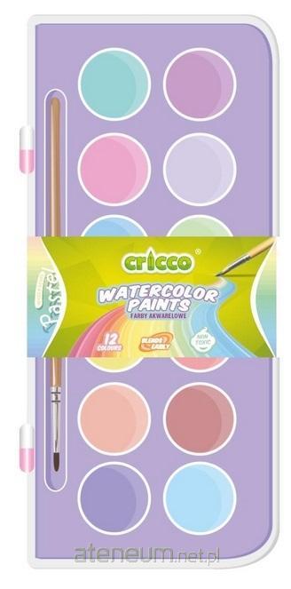 Farby akwarelowe Cricco pastelowe w 12 delikatnych kolorach. Krążki farb zamknięte w plastikowej kasetce z zawieszką oraz z pędzelkiem dołączonym do zestawu. Kolory można mieszać ze sobą, tworząc nowe odcienie. Mogą stanowić uzupełnienie do podstawowych kolorów farb akwarelowych lub plakatowych.