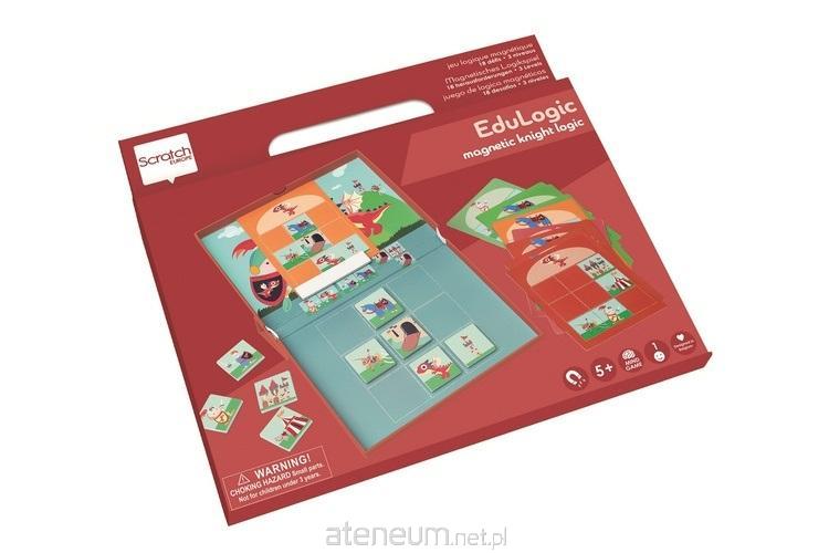 Gra polega na uzupełnieniu obrazka magnesami z rycerzami, smokami i zamkami. Uwaga: uzupełniane magnesy z obrazkami muszą być zawsze ułożone we właściwy sposób! W zestawie znajduje się 18 różnych kart zadań. Weź kartę zadania i przymocuj ją magnesem do górnej części pudełka Edulogic. Ułóż obrazki z karty zadania z prawidłowymi magnesami na dole. Użyj do tego płytek magnetycznych. Teraz spróbuj wypełnić puste miejsca, prawidłowo znajdując brakujące figurki. Spójrz na rysynkowe podpowiedzi znajdujące się pośrodku pudełka Edulogic. Kto lub co pasuje do siebie? Na przykład, rycerz musi być zawsze umieszczony na lewo od smoka (lub smok na prawo od rycerza), niebieski rycerz musi być umieszczony na lewo od niebieskiego konia (lub niebieski koń na prawo od niebieskiego rycerza) a brama zamkowa musi być umieszczona na lewo od zamku lub pod zamkiem. Czy udało Ci się uzupełnić obrazek? Odwróć kartę zadania i sprawdź czy poprawnie wykonałeś zadanie.