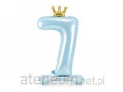 Stojący, metalizowany balon foliowy w kolorze błękitnym z koroną w kolorze złotym, rozmiar przed napompowaniem 103 cm (40.5''), rozmiar po napompowaniu 84 cm (33''). Do napompowania powietrzem.
