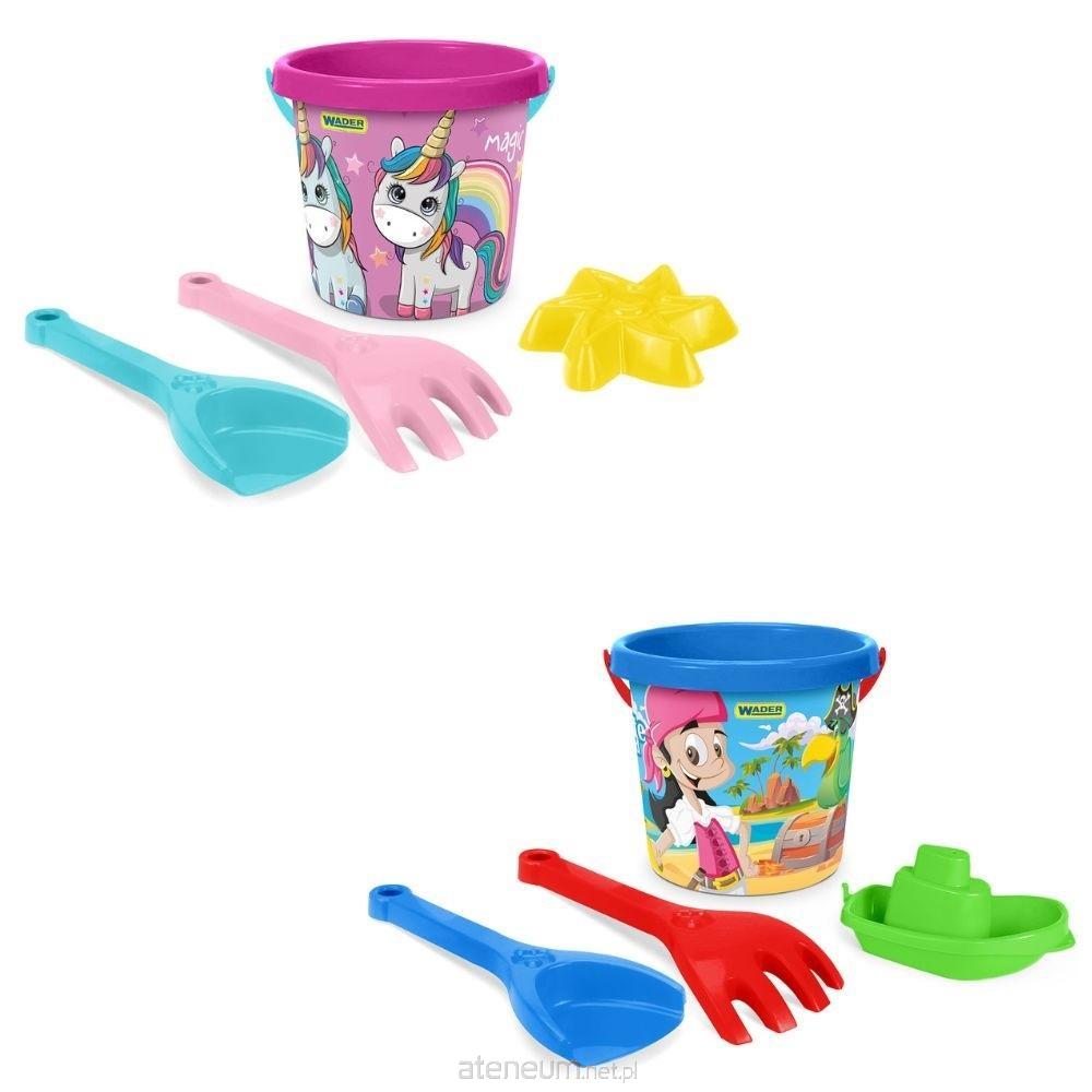 W skład zestawu wchodzi wiaderko, łopatka i grabki oraz foremka lub stateczek.