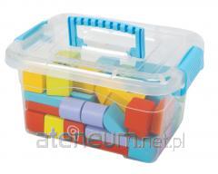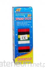 Zestaw składa się z różnokolorowych drewnianych klocków o różnych kształtach i rozmiarach. Dzieci mogą używać tych klocków do budowania wież, murów, budowli lub konstrukcji, łącząc je ze sobą w sposób, który pobudza ich wyobraźnię i kreatywność. Dodatkowo klocki należy umieścić w taki sposób, aby powstała stabilna wieża.