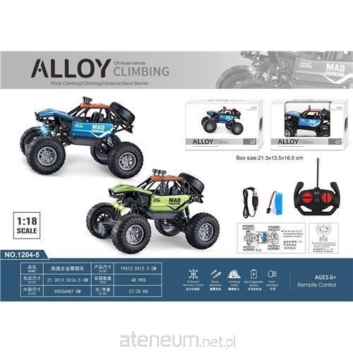 Samochód terenowy zdalnie sterowany z akumulatorem i ładowarką . Karoseria metalowa, gumowane duże koła, światełka na górze.