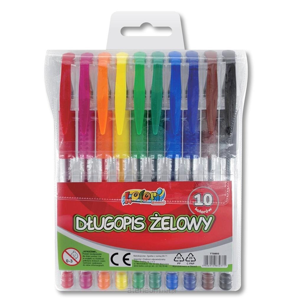 Komplet 10 sztuk długopisów żelowych tradycyjnych z końcówką kulkową 0,7 mm. Pakowane w etui z zawieszką. Nietoksyczne, zgodne z obowiązującymi normami