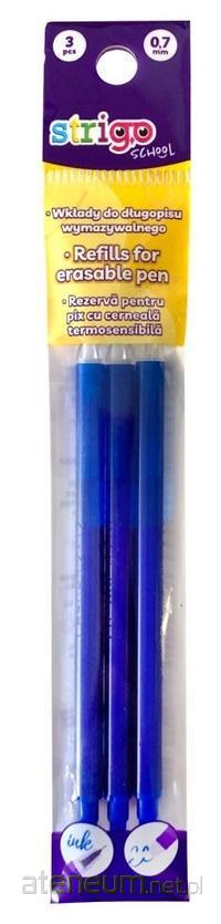 Zestaw trzech wkładów do długopisów wymazywalnych z kulkową końcówką. Wkłady posiadają tusz, który reaguje na działanie ciepła, znika po potarciu specjalną gumką. Unikalna formuła tuszu powoduje, że nie rozmazuje się i gwarantuje czyste pisanie. Szerokość końcówki piszącej 0,7mm. Kompatybilne ze wszystkimi długopisami wymazywalnymi Strigo.