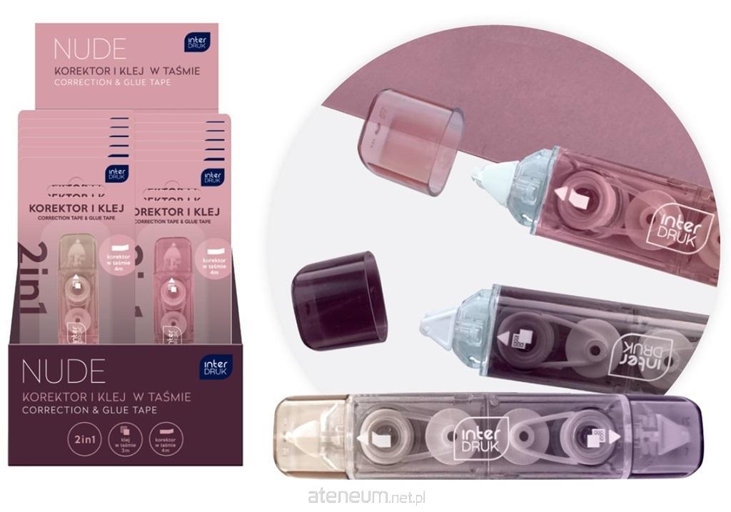 Kompaktowy i nowoczesny produkt 2w1, łączący korektor i klej w taśmie. Korektor w taśmie: 4 m długości, doskonała jakość krycia. Klej w taśmie: 3 m długości, nie brudzi rąk, bezbarwny i supermocny, łatwy w aplikacji. Do wyboru w 4 gradientowych kolorach obudowy. 12 szt. w displayu.