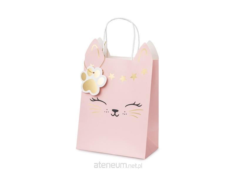 Torebki na prezenty w kolorze różowym z nadrukiem i zawieszką w kształcie łapki kotka oraz nadrukiem, wymiary bez uchwytów ok. 18 x 10,5 x 27,5 cm.