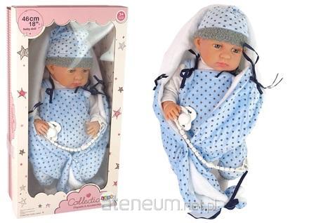 Lalka Bobas 46 cm Niebieska Smoczek Kocyk Gwiazdka Urocza lalka bobas zachwyci malucha. Zabawa będzie niezwykłym doświadczeniem, nauczy odpowiedzialności i empatii. Wymiar edukacyjny lalki zaprocentuje w przyszłości. Nauczy wykonywania podstawowych obowiązków związanych z opieką nad drugą osobą. Twoje dziecko uwielbia naśladować swoje kochające, troskliwe i opiekuńcze mamusie. Lalka wielkością i wykonaniem przypomina prawdziwe dziecko. Bobas ubrany jest w niebieskie spodnie i bluzę w gwiazdeczki. Wszystko idealnie do siebie pasuje, a materiał jest mięciutki w dotyku. Do bluzy dołączony został smoczek przypięty klamrą, dlatego nigdy się nie zgubi. Laleczka ma również piękny niebiesko- biały becik w czarne gwiazdki. Bobas ma ruchome ręce i nogi oraz główkę. Ubranko jest zdejmowane, co pozwoli na wymianę garderoby. Nóżki, rączki i głowa wykonane są z gumy przyjemnej w dotyku, która świadczący o bezpieczeństwie płynącym z jej użytkowania, a także długiej żywotności zabawki. Tułów jest mięciutki, wykonany z miękkiego materiału. Całość zapakowana jest w otwierane pudełko z przezroczystą witrynką na przodzie, idealnie nadaje się na prezent. Elementy zestawu: - laleczka bobas - smoczek - becik Długość lalki: 46 cm Wymiary pudełka: 50 cm x 27 cm x 14 cm Lalka przeznaczona jest dla dzieci powyżej 3 roku życia. Zabawka posiada certyfikat CE i jest zgodna z normą EN 71.