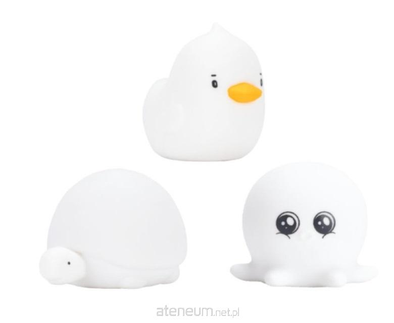 Zestaw lampek Mini Wodne to trzy świecące wodne zwierzątka, wprost idealne dla małych rączek. Lampki są wodoodporne i unoszą się na wodzie, dzięki czemu mogą towarzyszyć dziecku podczas kąpieli. W skład zestawu MINI WODNE Rabbit & Friends wchodzą trzy mini lampki: Kaczka, Żółw i Ośmiornica. Mają charakterystyczne i urokliwe kształty. W kolorze białym z czarnymi oczkami. Są lekkie i wygodne do chwytania przez małe rączki. Lampki zapewniają kojące towarzystwo w trakcie wieczornych zabaw i ułatwiają proces zasypiania. Nieco starszych dzieciom posłużą jako przenośne oświetlenie w drodze przez ciemny korytarz do łazienki lub sypialni rodziców. Paleta kolorów lampek tworzy niepowtarzalny, harmonijny, wypełniony miękkim światłem klimat. Lampki działają na poklepywanie. Po włączeniu świecą biały, ciepłym światłem. Klepniecie silikonowej powierzchni powoduje zmianę kolorów. Pozostawione bez aktywności wyłączają się automatycznie po 60 sekundach. Obsługa lampek jest intuicyjna - nawet małe dziecko poradzi sobie bez problemu. Klasa szczelności IP 67 umożliwia zanurzenie lampek w wodzie na głębokość do 1 m, ale nie dłużej niż na pół godziny. Warunkiem korzystania z lampek w wodzie jest prawidłowe zamknięcie dolnej pokrywy. Lampki Mini Wodne nie mają ostrych krawędzi ani się nie nagrzewają (technologia LED). Zasilane są poprzez baterie: CR 2025. Każda lampka ma baterię. Do zestawu dołączone są zapasowe baterie w ilości 6 sztuk. Lampki wykonane są z wysokiej jakości, certyfikowanego, bezpiecznego, wolnego od BPA, silikonu. Cechy: