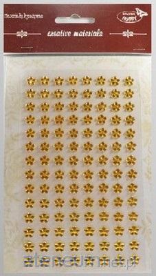 Stiker z 112 samoprzylepnymi kryształkami wielkości 8 mm. Rodzaj : Kwiaty złociste . Duży stiker z oddzielnymi samoprzylepnymi kryształkami wielkości 8 mm w kształcie kwiatu. Każdy stiker zawiera 112 elementów. Wielkość stikera 12.5x24.5 cm