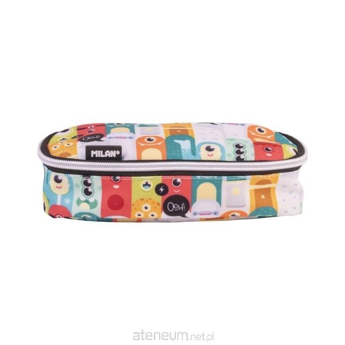 Piórnik owalny MILAN zapinany na suwak, z dodatkową wewnętrzną kieszonką z siatki. Seria specjalna Aliens, z wesołym wielokolorowym wzorem ułożonych kosmitów, te same postacie co w drewnianej zabawce "Wieża kosmitów". Czarna wewnętrzna podszewka. Materiał zewnętrzny i wewnętrzny 100% poliester. Wymiary: 20,5 x 9 x 5,5 cm.