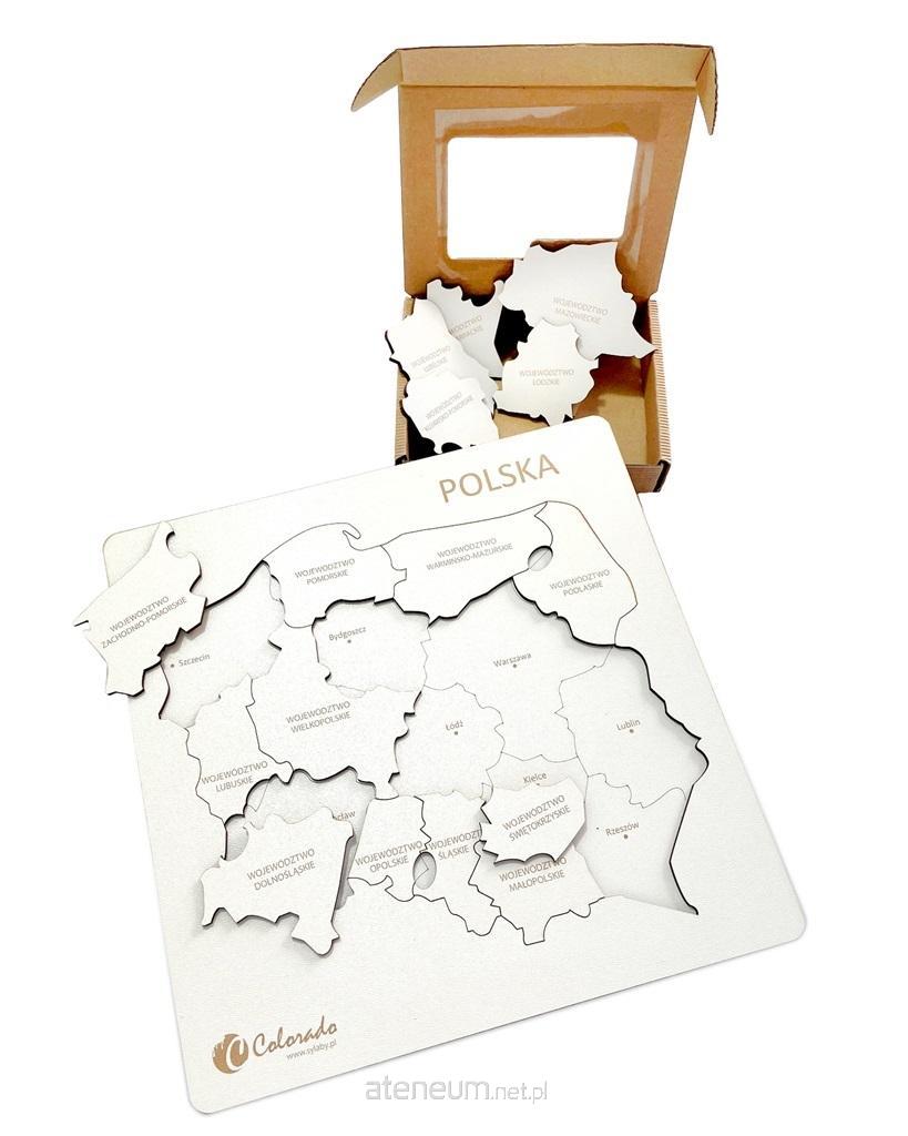 16 puzzli w kształcie województw z wygrawerowanymi ich nazwami.
