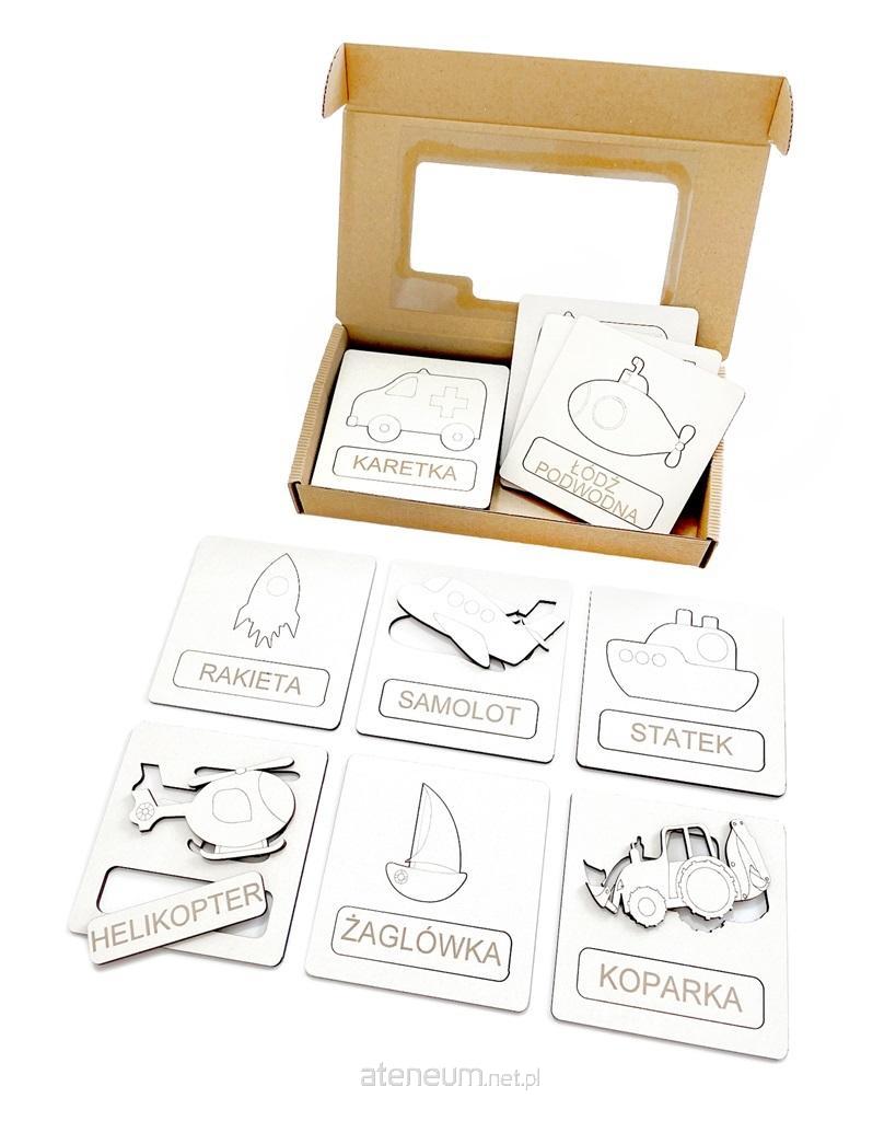 Zawiera 45 elementów (15 tabliczek z wyciętymi kształtami, 15 kształtów, 15 nazw kształtów).