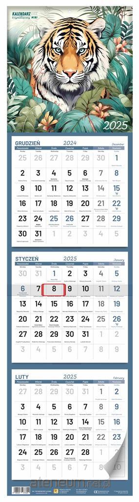 Kalendarz trzymiesięczny z okienkiem i wypukłą główką w dwóch różnych wzorach graficznych (kwiaty, tygrys).