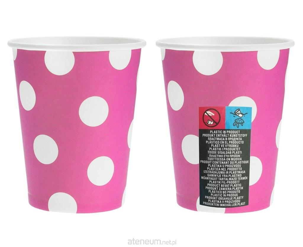 Papierowe kubeczki w kolorze magenta z białymi groszkami.