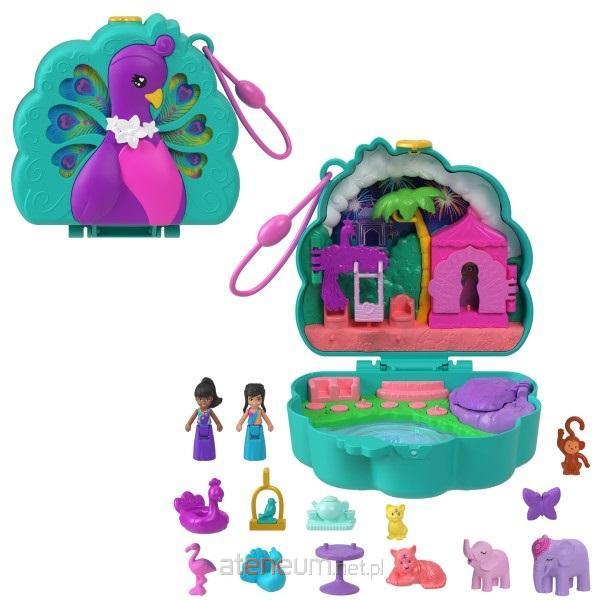 Zestaw kompaktowy Polly Pocket Ogród pawia zawiera 2 mikrolalki i 12 akcesoriów, w tym figurki zwierzęcych przyjaciół.