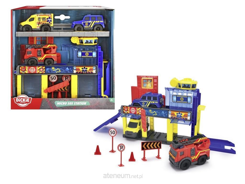 Stacja ratownicza z ruchomymi elementami i 3 pojazdami na licencji Mercedes-Benz - policja, straż pożarna i karetka. Stacja ma ręczną windę, obracającą się wieżę, rampę zjazdową, grafikę płomieni na budynku. Dodatkowo w zestawie akcesoria. Pojazdy mają długość 9 cm, 3l+