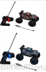 Duży Monster Truck z wolnym kołem, pracującym zawieszeniem. Malowany natryskowo, dzięki czemu wzór na pojeździe daje efekt 3D. Opakowanie przystosowane do ustawiania produktu w pionową wieżę, jeden na drugim. Długość: 38,5 cm, 3l+