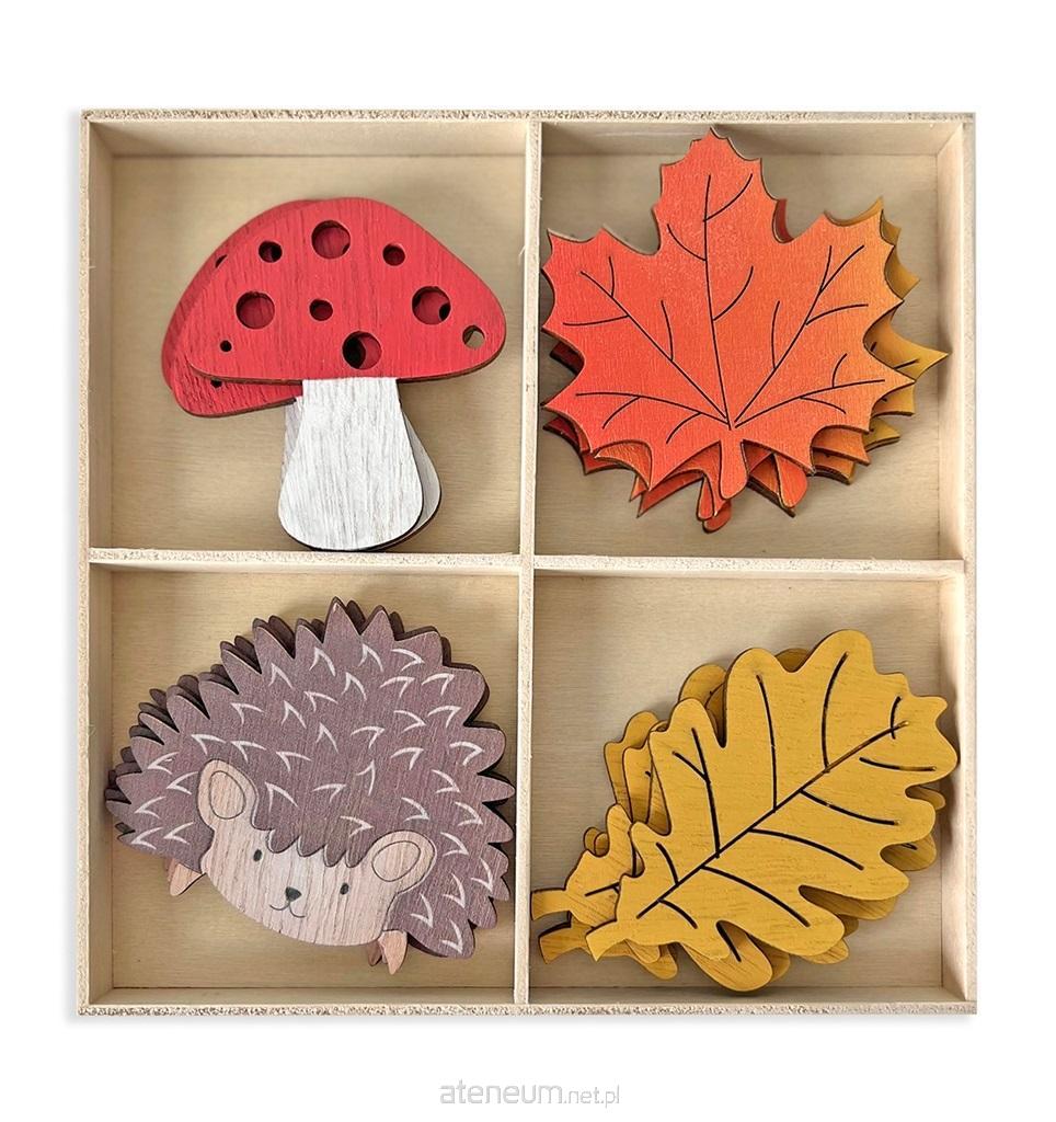 Zestaw drewnianych kształtów z jesiennymi motywami, wśród których znajdziesz urocze jeżyki, grzybki z dziurkami oraz liście klonu i dębu. Wszystkie elementy są pomalowane i nie wymagają dodatkowego zdobienia.