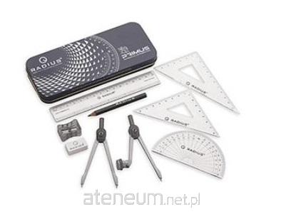 Zestaw geometryczny w metalowym opakowaniu, zawiera 9 elementów: 2 x cyrkiel, ołówek, 2 x ekierka, kątomierz, linijka, temperówka, gumka