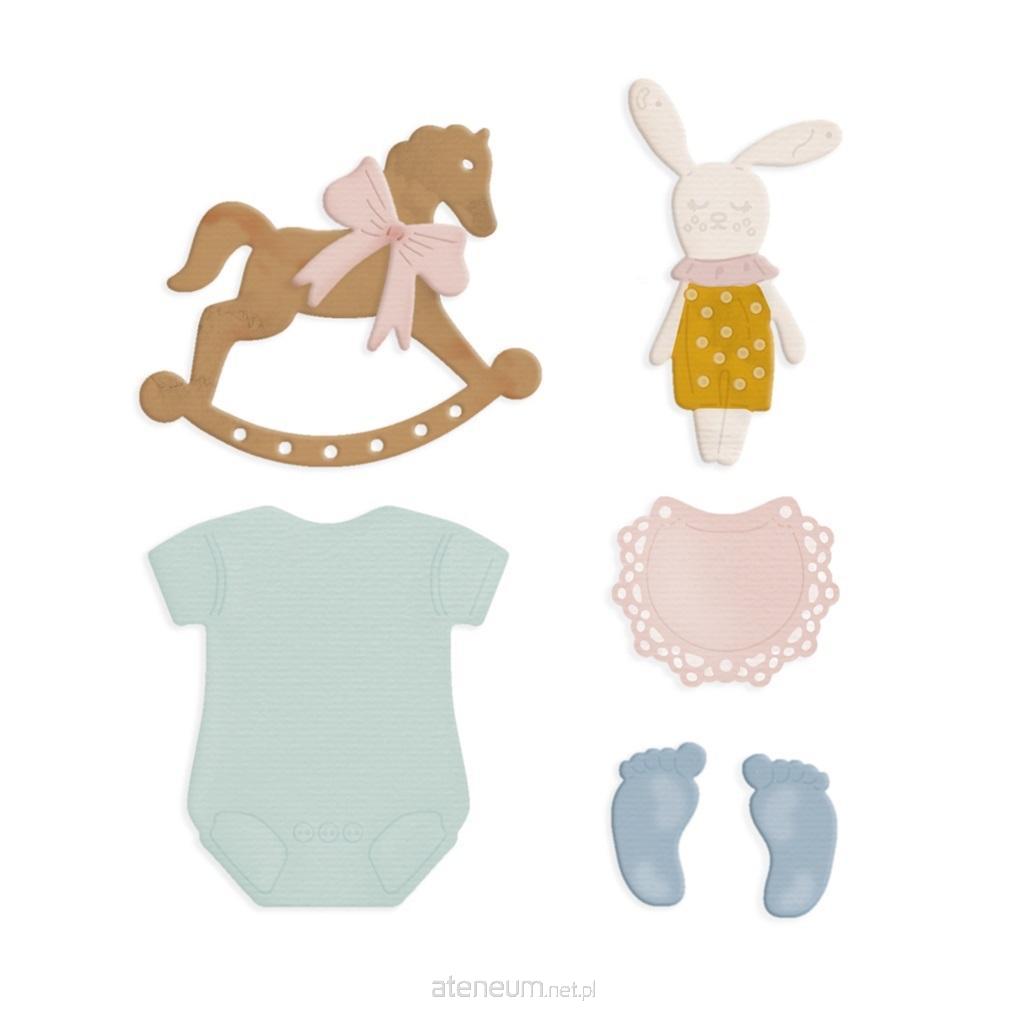 Zestaw wykrojników baby jest idealny do wszelkich projektów dziecięcych. W pakiecie znajduje się 6 wykrojników: małe stópki (lewa i prawa), kokardka, konik na biegunach, zajączek w ubranku, dziecięce body i koronkowy śliniaczek. Wykrojniki z tego zestawu są częścią kolekcji baby, w skład której wchodzą jeszcze kształty papierowe, drewniane oraz naklejki baby boy i baby girl.