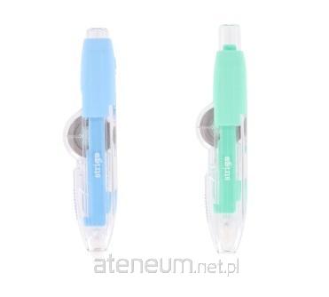Korektor w taśmie z automatycznym mechanizmem zabezpieczającym przed zabrudzeniem i uszkodzeniami. Ergonomiczny kształt zwiększa komfort użytkowania. Wyjątkowo odporna taśma nie rozrywa się ani nie pęka. Korektor szybko schnie, dzięki czemu poprawek można dokonywać natychmiast po jego użyciu. Możliwość stosowania na wszystkich rodzajach papieru. Szerokość taśmy: 5mm, długość taśmy: 8m. Dostępny w 2 kolorach obudowy: zielony, niebieski.