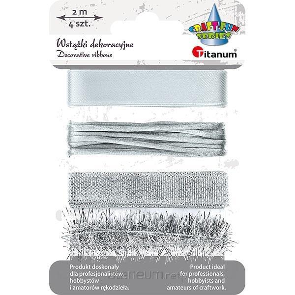 Wstążki tekstylne 15mm satynowa i brokatowa, foliowa 15mm, sznurek pleciony 2mm srebrne 4szt.