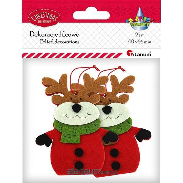 Zawieszki filcowe 3D renifery 75x90mm w czerwonym płaszczu z zielonym szalikiem 2szt.