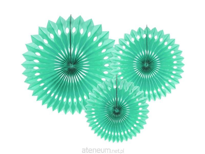 Rozety dekoracyjne wykonane z bibuły w kolorze miętowym, średnice po złożeniu ok. 20 cm, 25 cm i 30 cm. Produkt wielokrotnego użytku. Montaż przy pomocy spinacza.(1 op. / 3 szt.)