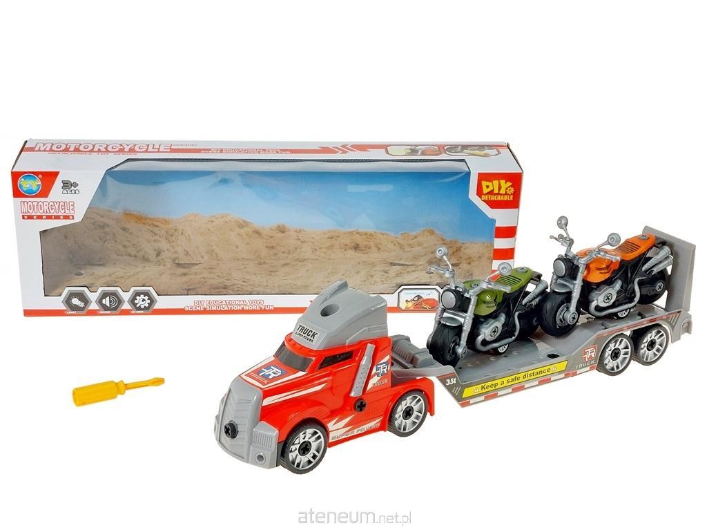 Auto z lawetą i 2 motocyklami do skręcania, światło, dźwięk.