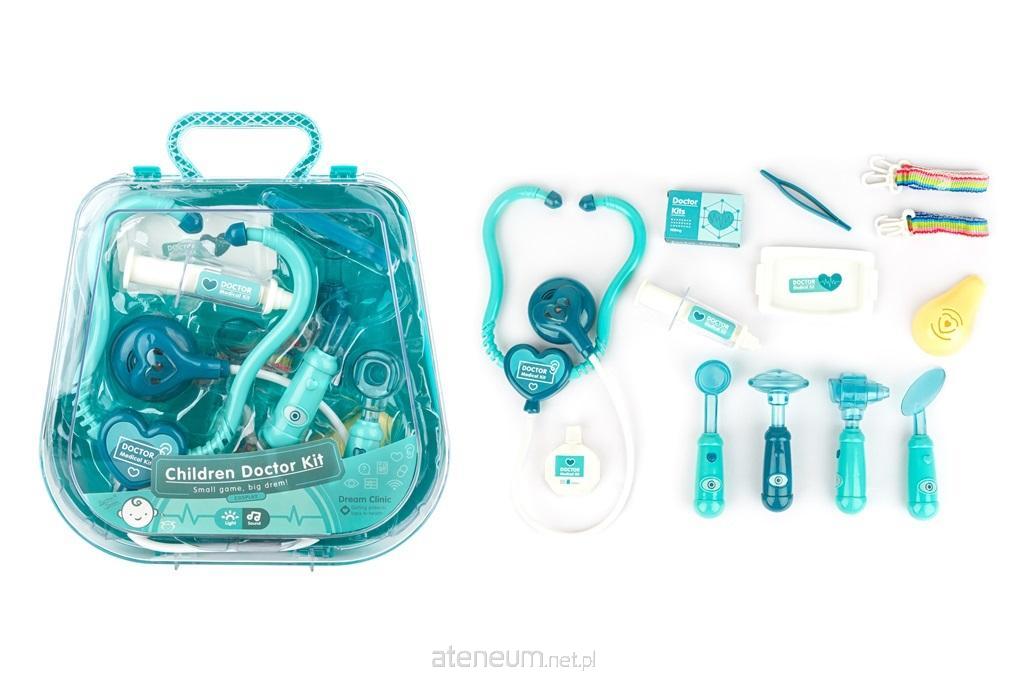 W zestawie: stetoskop, 4 urządzenia do badań, strzykawka, szczypce, 1 pojemnik na lek, tacka, kartonik na lek, Funkcje: stetoskop - po naciśnięciu przycisku słychać dźwięk bicia serca, podświetla się dioda do rytmu, 2 urządzenia do badań podświetlają się, Pozostałe informacje: wym. opak. 31 x 27 x 8 cm, baterie 2 x ag13 (stetoskop), 4 x ag13 (2 urządzenia do badań) dołączone testowe, 3+