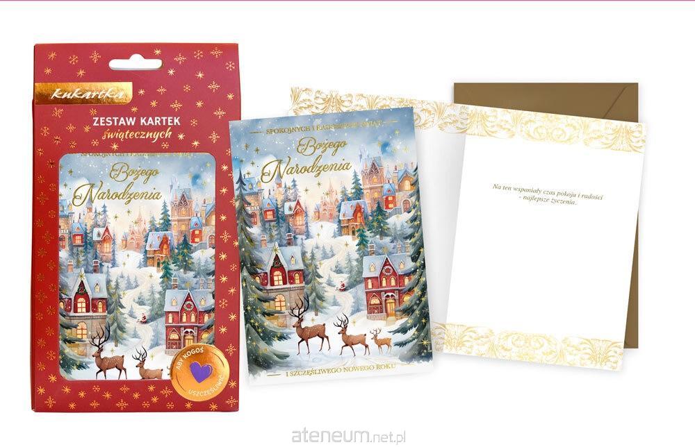 Zestaw kartek świątecznych ZKA-004 Zestaw zawiera 10 jednakowych kartek świątecznych z kopertami. Karnety są kolorowe i uszlachetnione metalizowaną folią hot-stamp. Ten zestaw to idealne rozwiązanie, aby mieć zawsze pod ręką zapas pięknych kartek świątecznych, gotowych do wręczenia bliskim i znajomym w okresie świątecznym. Kartki zawierają życzenia w środku oraz dopasowaną kopertę. Specyfikacja: Wymiary kartki: 10 x 15 cm (po złożeniu) Wymiary opakowania: 11,2 x 1,5 x 20,5 cm (długość x szerokość x wysokość) wnętrze: życzenia w środku zdobienia: metaliczna folia okazja: BN