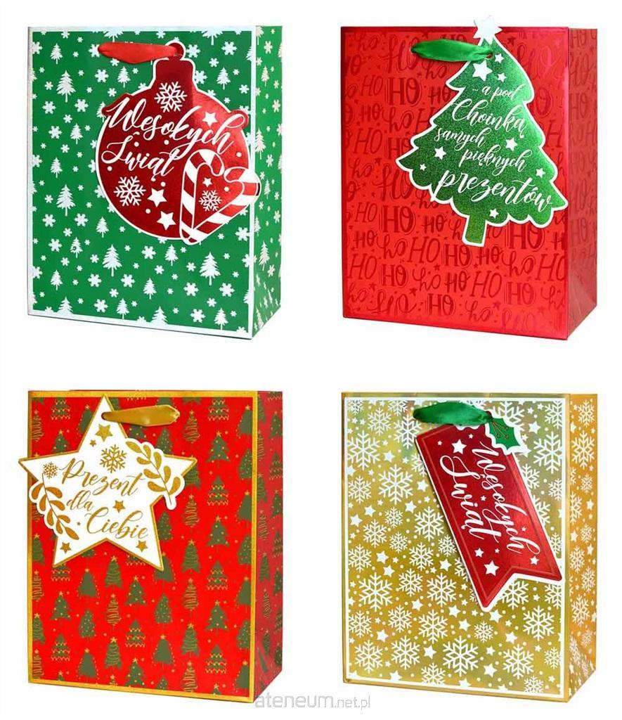 Torby z serii QP, oprócz świetnej jakości serii Q, wyróżniają się posiadaniem dodatkowego elementu dekoracyjnego - np.. doklejanej kokardki lub odstawnika, grubszego brokatu, złoconej zawieszki itp.. W takiej torbie każdy prezent zyskuje na prestiżu. Cechy szczególne: typ produktu: torba na prezent, zdobienie: metaliczna folia, wielkość orientacyjna: 17,7 x 22,8 x 9,8 cm (szerokość x głębokość x wysokość), okazja: Boże Narodzenie