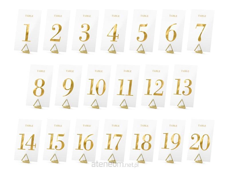 Numery na stół wykoane z transparentnej folii z złotym metalizowanym nadrukiem cyfr, zestaw zawiera numer od 1 do 20, rozmiar ok. 7 x 12 cm.(1 op. / 20 szt.)