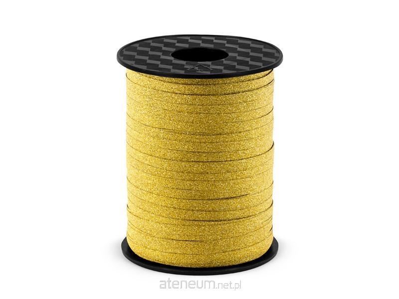 Wstążka plastikowa brokatowa w kolorze złotym, szerokość ok. 5 mm, długość ok. 225 m.