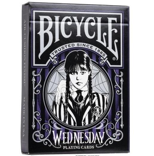Wkrocz do mrocznego świata Akademii Nevermore z Bicycle Wednesday! Zainspirowana hitowym serialem Netflixa z Jenną Ortegą w roli Wednesday Addams; Twoja następna gra karciana to pełen emocji taniec z makabrą, gdy tasujesz atramentowo-czarne karty z ulubionymi przez fanów postaciami z serialu.