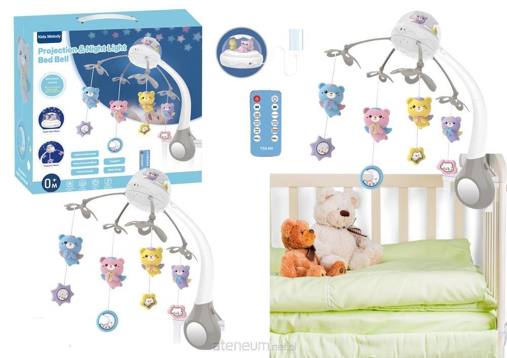 Karuzela Do Łóżeczka Projektor Pilot Melodie Odgłosy Zwierząt Szary Bajecznie kolorowa karuzela do łóżeczka to znakomity przyjaciel maluszka, który pomaga w zasypianiu. Przyjemne melodie i nocne światło uspokoją maluszka, a sam będziesz mógł pilnować dziecko przy zgaszonym świetle, dzięki funkcji projektora. Kolorowe gwiazdki i zawieszki w kształcie przyjaznych misiów zainteresują malucha, który zacznie wyciągać rączki i chwytać wiszące przedmioty. Poznają przy tym fakturę i kształt zawieszki oraz rozwijając siłę mięśniową. Boczne elementy wykonane są z miękkiej gumy, nietoksycznej, mogą służyć jako gryzak. Od najmłodszych dbaj o rozwój Twojego dziecka. Karuzelę można zamontować na łóżeczku dziecka i w wózeczku, wychodząc na spacer (wystarczy odłączyć karuzelę od projektora i przymocować do baldachimu wózka). Obraz emitowany przez projektor przyciąga uwagę dziecka. Karuzela posiada regulację natężenia głośności. Dzięki regulowanemu uchwytowi, karuzela pasuje do większości łóżeczek szczebelkowe. Przy podstawie urządzenia zamontowano lusterko, w którym dziecko może się oglądać. Całość sterowana jest za pomocą pilota, który reguluje oświetlenie, głośność oraz wydawane dźwięki. Funkcje karuzeli: - czysty, spokojny dźwięk wygrywanych melodii - dużo melodii do zasypiania - odgłosy zwierząt - dźwięki instrumentów - melodie przypominające odgłosy natury - regulacja głośności - projekcja gwiazdek i księżyca -karuzela z projektorem obraca się - możliwość włączenia/wyłączenia obracania się karuzeli - sterowanie za pomocą pilota - uniwersalne mocowanie - pasuje do większości łóżeczek szczebelkowych - karuzela nie wymaga nakręcana - jest zasilana 3 bateriami "AA" (brak w zestawie) Znakomity pomysł na prezent. Wymiary karuzelki: 52 cm x 31 cm x 32 cm Wymiary pudełka: 37 cm x 29 cm x 11 cm Przeznaczona dla dzieci już od pierwszych dni życia. Zgodna z normą EN71 i certyfikatem CE. Karuzelka zasilana jest trzema bateriami 1,5 V AAA, brak w zestawie.
