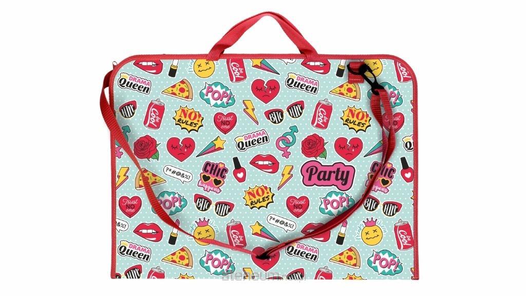 Teczka wykonana ze sztywnego tworzywa PP z ozdobnym nadrukiem oraz obszyciem w kontrastowym kolorze. Wymiary teczki 38x52 cm umożliwiają przechowywanie prac plastycznych w formacie A3 z zapasem miejsca. Wyposażona w zamknięcie na suwak oraz materiałowe rączki i odpinany pasek na ramię. Dodatkowa kieszeń wewnątrz ułatwia utrzymanie porządku. Grzbiet o szerokości 3 cm pozwala na przechowywanie w teczce przyborów plastycznych.