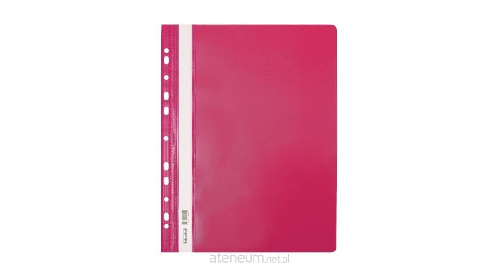 Skoroszyt wykonany z twardej folii PVC, przód przezroczysty, tył kolorowy. Europerforacja umożliwiająca wpięcie do segregatora z dowolnym ringiem. Wewnątrz klasyczny mechanizm z wąsem i listwą skutecznie zabezpieczający wpiętą zawartość; wąs o długości 16,5 cm. Na bocznej krawędzi wymienny, papierowy pasek do opisu zawartości z kodem kreskowym na szt. Dwa wycięcia ułatwiające wysuwanie paska. Zaokrąglone rogi obu okładek.