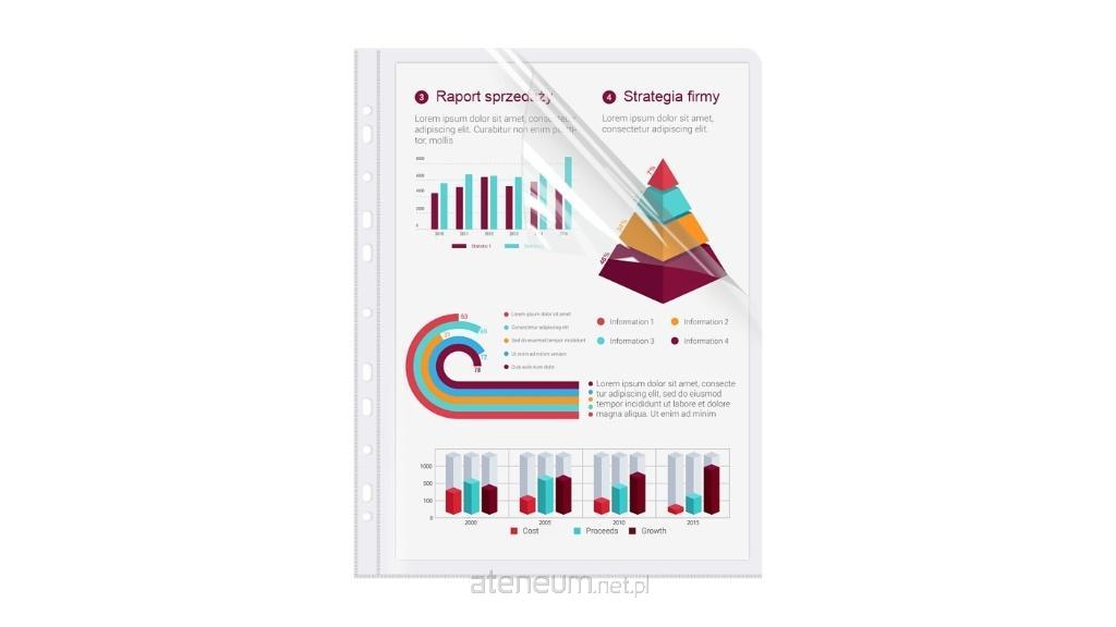 Przód i tył z przezroczystej twardej folii PVC typu 0,15. Zgrzew w kształcie litery "L". Boczna perforacja umożliwiająca wpięcie do segregatora z dowolnym ringiem. Format A4.