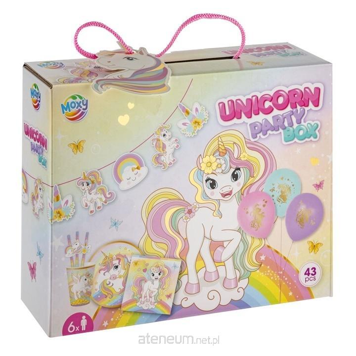 Uroczy zestaw na imprezę dla 6 dzieci w jednorożce. Zestaw zawiera: 6x kubek, 6x słomka, 6x talerz, 12x serwetki, 12x balony, 1x girlanda