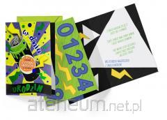 Zaproszenia w kompletach po 10 sztuk. W zestawie znajduje się koperty, kolorystycznie uzupełniające się z zaproszeniami.