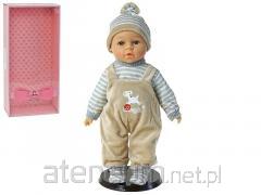 Winylowa lalka hiszpańska Pablo 0367851 to wyjątkowa propozycja od cenionej marki ASI. Realistycznie wyglądający, 43-centymetrowy chłopiec zachwyca wysoką jakością wykonania i pogodną buzią. Został wykonany w całości w Hiszpanii, z przyjemnego w dotyku, miękkiego i bezpiecznego winylu. Bobas ma wyraźnie zaznaczoną płeć oraz pępek. Doskonale sprawdza się także podczas zabawy w kąpieli. Jest przeznaczony dla maluchów w wieku od 3 lat. Ekskluzywna hiszpańska lalka ASI Pablo jak prawdziwe dziecko Dzięki skrupulatnie dopracowanym detalom lalka hiszpańska ASI Pablo 0367851 wygląda jak żywe niemowlę: niebieskie oczy o głębokim spojrzeniu opatrzone są długimi rzęsami i ręcznie malowanymi brwiami, zwracają uwagę lśniące usteczka i rumieńce na policzkach, główka posiada wyrzeźbione, typowo niemowlęce włosy, nóżki i rączki mają delikatne fałdki oraz wyrzeźbione paznokcie, Bobasa można posadzić lub położyć w różnych pozycjach dzięki ruchomym kończynom i głowie. Pablo inspiruje dzieci do kreatywnej zabawy i wcielania się w rolę troskliwego opiekuna. Lalka hiszpańska Pablo w oryginalnym opakowaniu prezentowym Pablo jest ubrany w ręcznie szyte, bawełniane jasnobeżowe śpioszki w delikatne kropeczki. Dzięki zastosowaniu zapięcia na rzep łatwo jest ubranko zdjąć. Zielony ciepły płaszczyk z kapturem, ozdobiony guziczkami, przyda się w chłodniejsze dni. Zabawę urozmaica butelka. Oryginalne, designerskie opakowanie z wieczkiem może spełniać rolę łóżeczka dla bobasa.