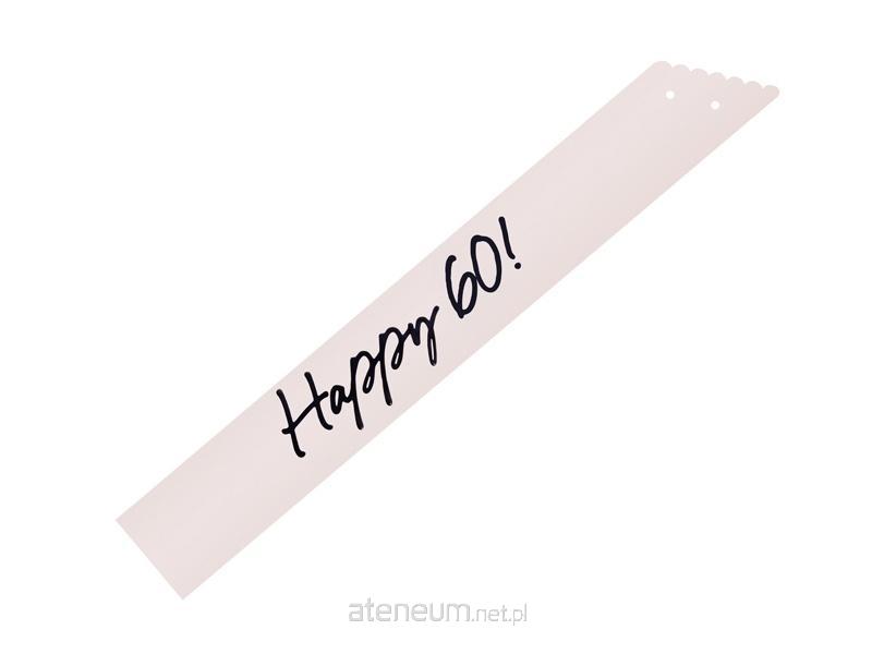 Szarfa papierowa Happy 60 w kolorze kremowym z czarnym nadrukiem, szerokość ok. 9,5 cm, długość ok. 76 cm. W zestawie czarna aksamitna wstążka do związania szarfy.