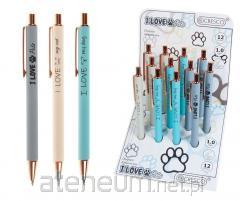 Długopis automatyczny z motywami fantazyjnymi, system zatrzaskowy. Niebieski atrament, który można wymazać przez tarcie gumą, którą ma na górnym końcu. Podczas pocierania tusz znika bez pozostawiania śladu ani plamy na papierze i pozwala szybko przepisać go ponownie. Plastikowy korpus z zabawnymi wzorami. Końcówka 0,5 mm. Rozmiar110 mm. Wzór dinozaura w kolorze niebieskim,jasnoniebieskim, zielonym i czerwonym.48 sztuk.