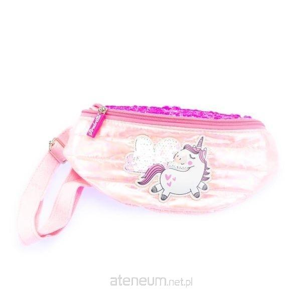 Regulowany pasek, kieszeń na zamek, aplikacja z jednorożcem z przodu nerki.