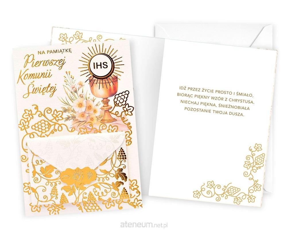Kartka Dream Cards na I Komunię Świętą DK-1242 Kartka B6 z ozdobnej serii Dream Cards - nieduża, ale robi wrażenie dzięki atrakcyjnej kolorystyce i ciekawym zdobieniom. To idealny wybór łączący przyjazną cenę z jakością. Cechy szczególne: wielkość: B6, 16.6 x 11.7 cm po złożeniu, koperta: w zestawie, kolorowa, zdobienia: kolorowe, różnorodne, bogate (w zależności od wzoru: przyklejane dekoracje, elementy biżuteryjne, odstawniki, metaliczne folie, tłoczenia itp.), okazja: Komunia Święta