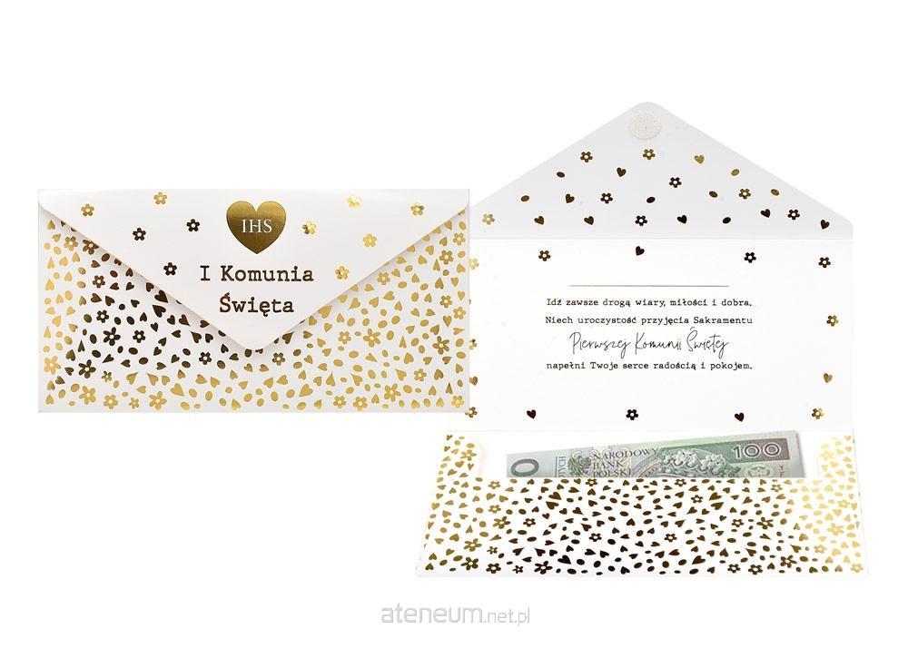 Koperta podarunkowa na I Komunię Świętą KOP-007. Koperta podarunkowa jest eleganckim sposobem na podarowanie bliskiej osobie banknotu lub karty podarunkowej. Koperta jest kolorowa i uszlachetniona metalizowaną folią hot-stamp, jest solidnie wykonana i wyposażona w rzep, co umożliwia jej wielokrotne otwieranie i zamykanie. Koperta zawiera życzenia w środku. Specyfikacja: wymiary: 20 x 10,5 cm (po złożeniu) wnętrze: życzenia w środku okazja: Komunia