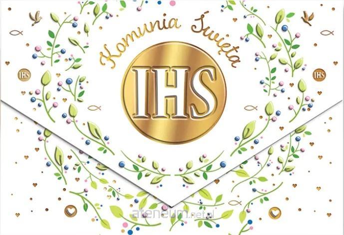 Karnet z kieszonką na pieniądze w formacie A5, składany z trzech. Złocony i tłoczony, teksy życzeń w środku. Wydrukowany na wysokiej jakości papierze. W zestawie koperta.