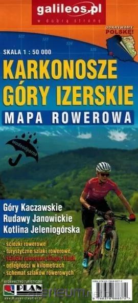 Składana, laminowana mapa szlaków rowerowych w Karkonoszach i Górach Izerskich w skali 1:50 000 wydawnictwa Galileos. Przedstawione trasy rowerowe zostały wyróżnione i obejmują Karkonosze, Góry Izerskie, Kotlinę Jeleniogórską, Rudawy Janowickie oraz znaczną część Gór Kaczawskich i Pogórza Izerskiego.